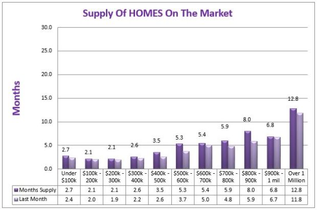 In other market news this month, active listing inventory continues to rise. The monthly increases haven't been all that impressive, but it's welcome news nevertheless. The Denver real estate market is still absorbing inventory at a rapid pace. Here's a snapshot of the available supply of homes by price range. Even though supply is rising, it's still extremely low under the 500k. In a healthy and balanced real estate market, we need to see between 4-7 months supply in most price brackets.