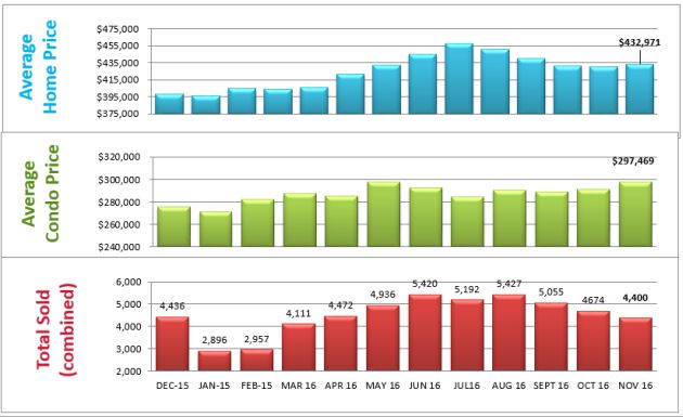 Home values inched up a bit in November, once again surpassing the $400,000 mark. The average sale price for a single-family home in the Denver Metro area last month was $437,231, up 10% as compared to last year. The average sale price for a condo/townhome was $297,398, a year-over-year increase of 8%.