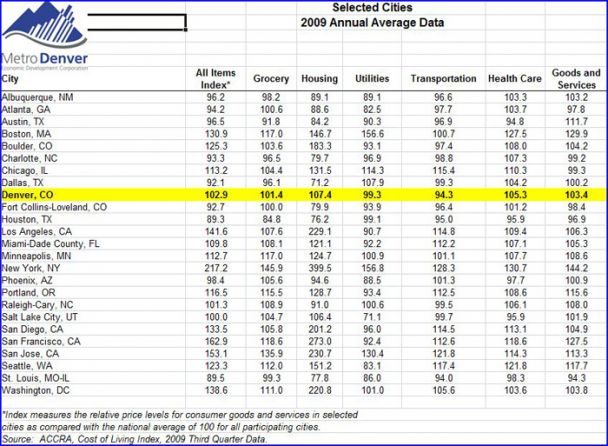 The Cost Of Living In Denver ranks just above the national averages, but well below many other major metropolitan areas, including both coasts. According to the ACCRA Cost of Living Index 2009 Third Quarter data, Denver ranks slightly above the national average of 100, with a composite index of 104.3.